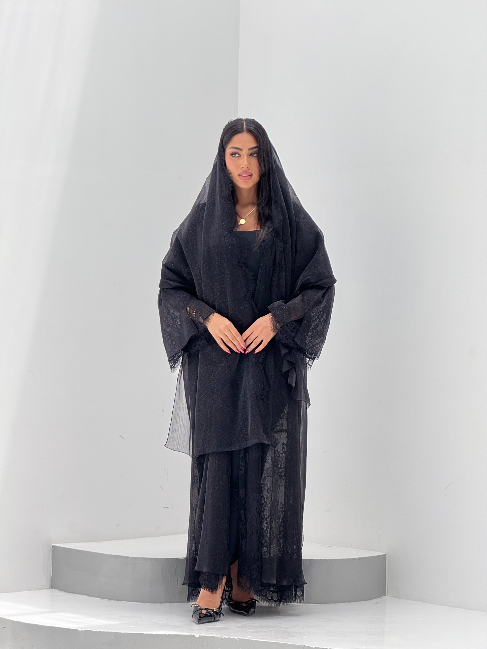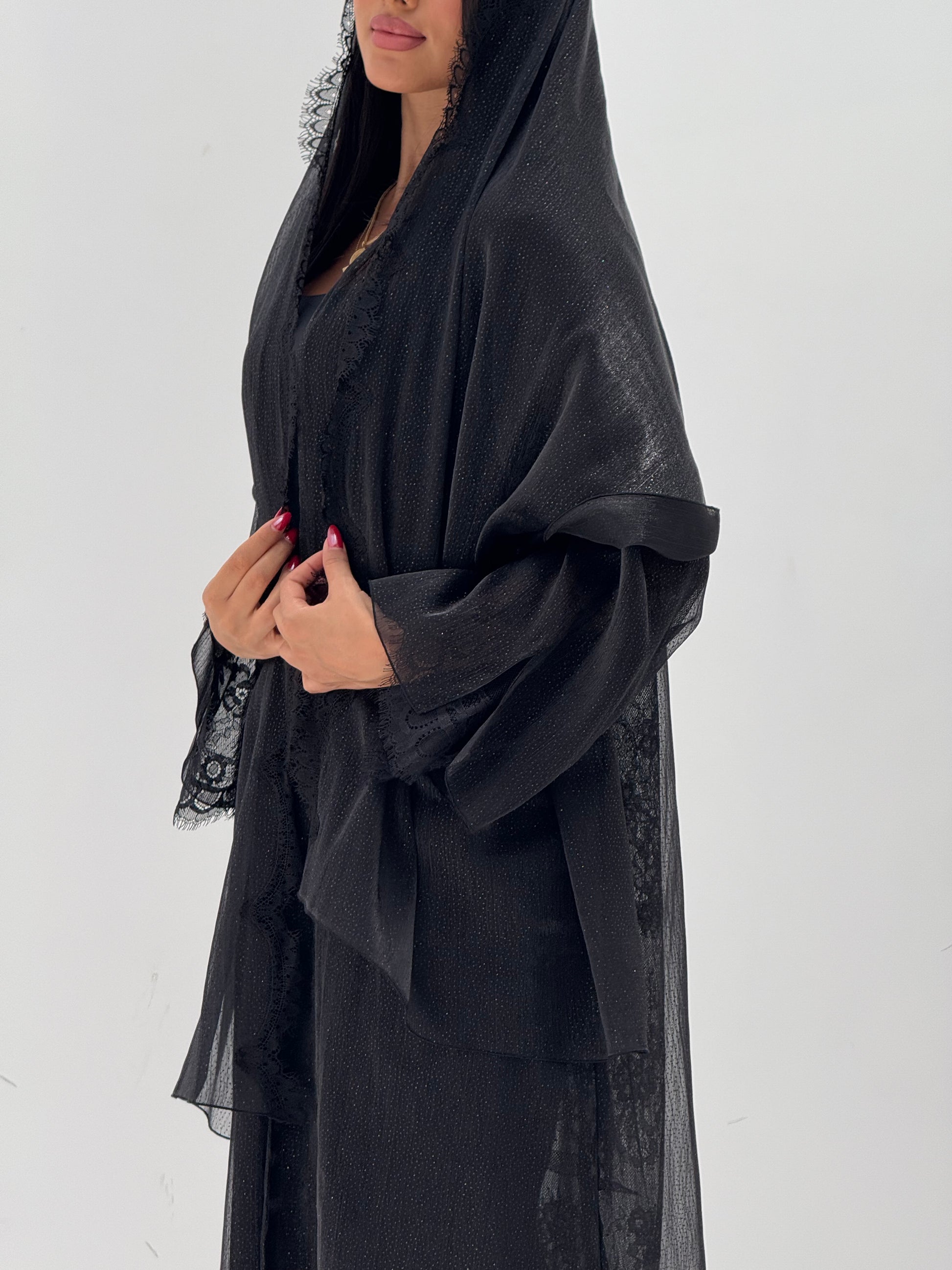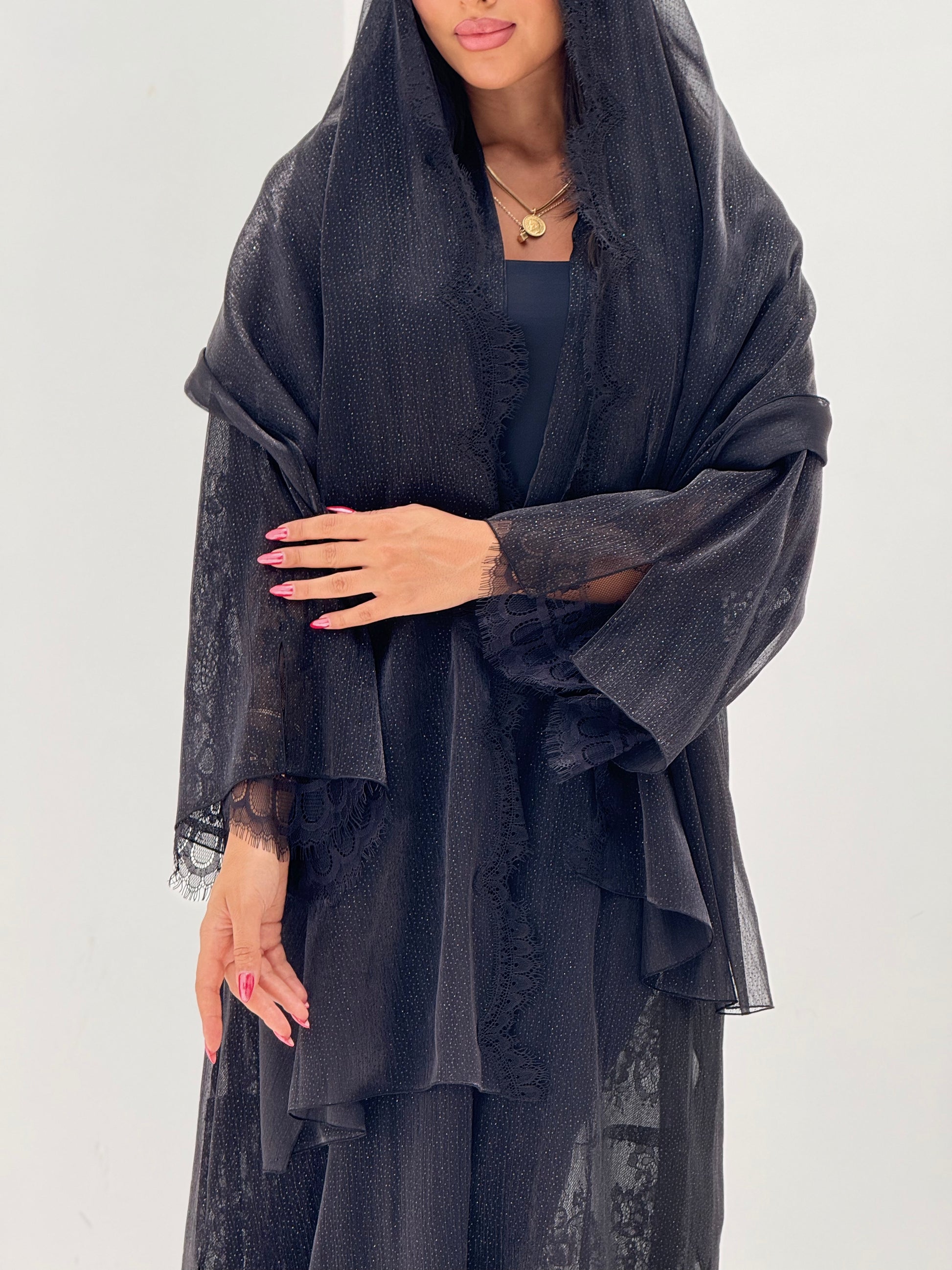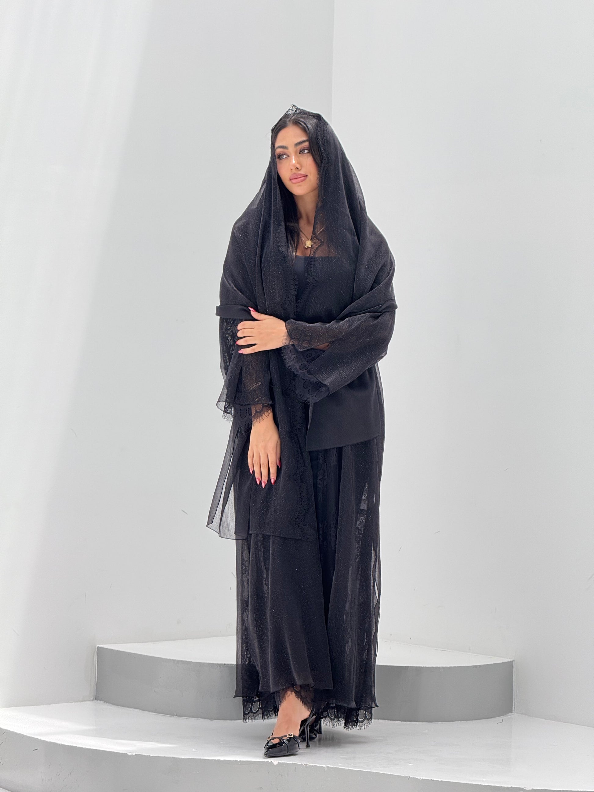 القماش: اورقنزا بلمعه مبطن بالدانتيل - شيله نفس قطعة العباه مع دانتيل على الاطراف