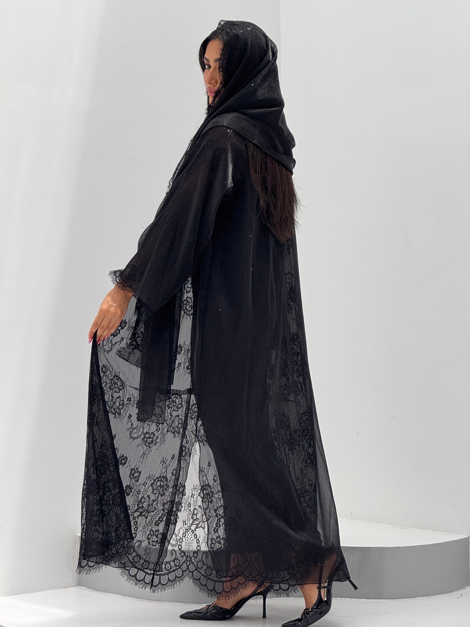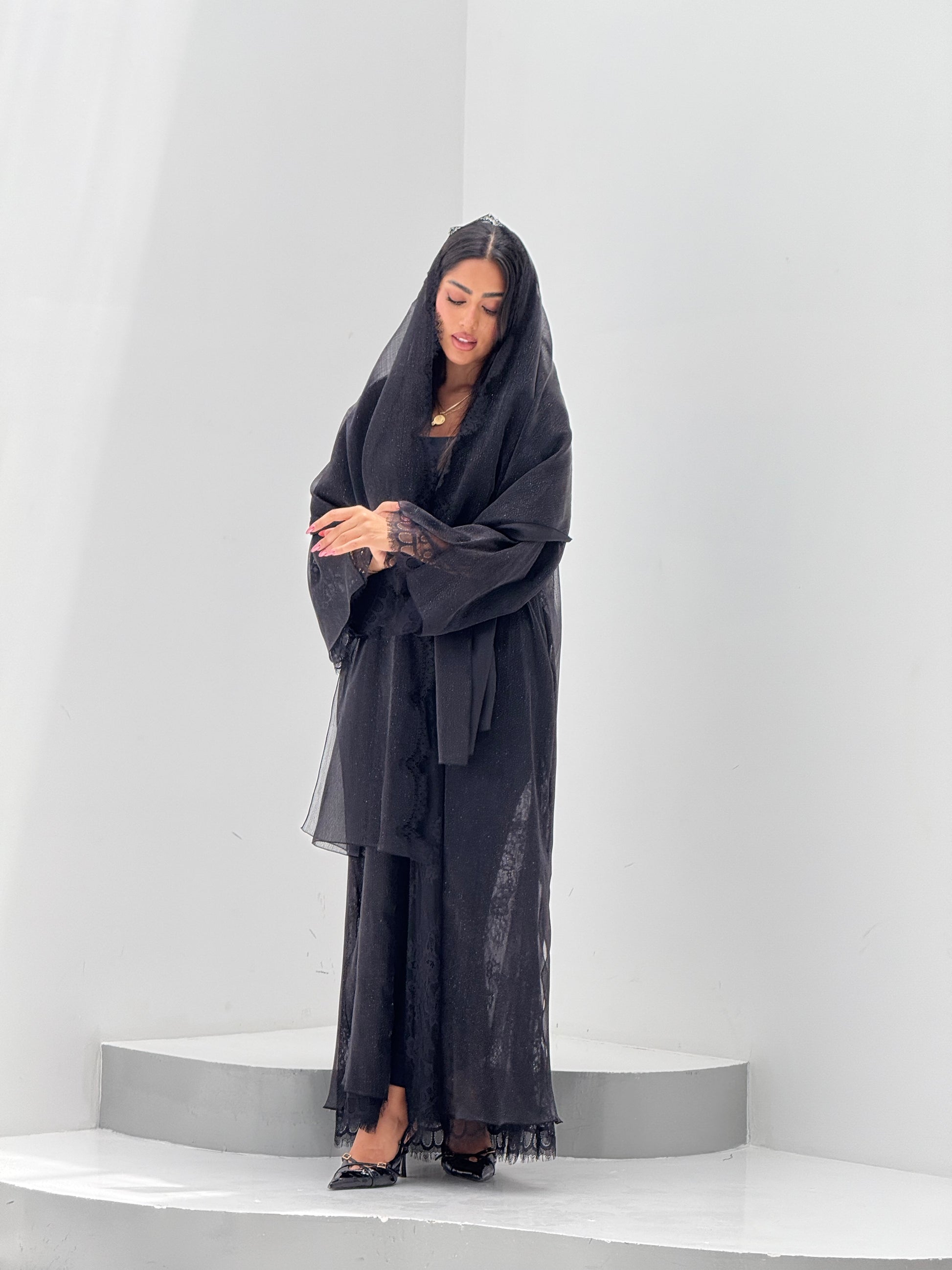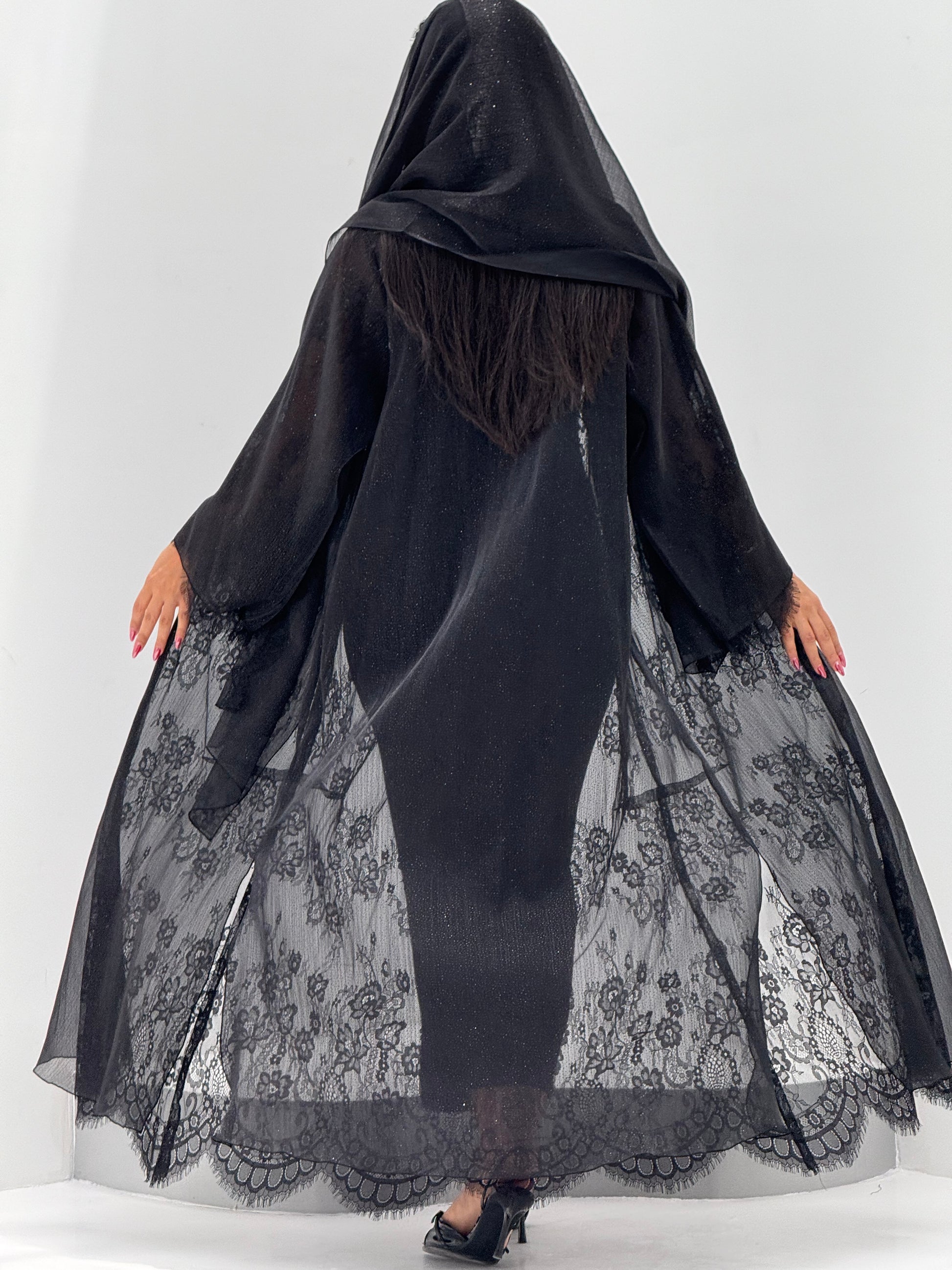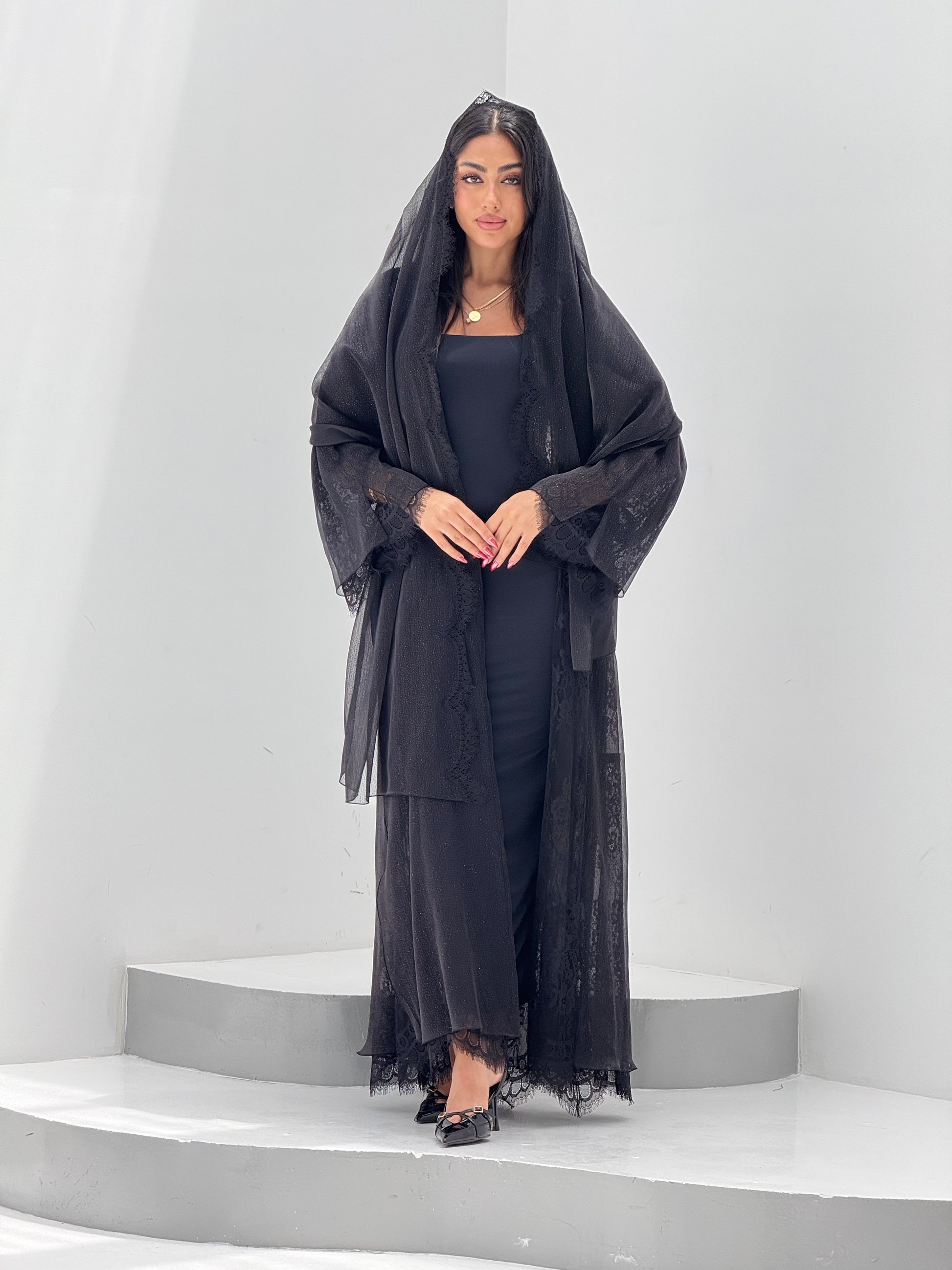 القماش: اورقنزا بلمعه مبطن بالدانتيل - شيله نفس قطعة العباه مع دانتيل على الاطراف
