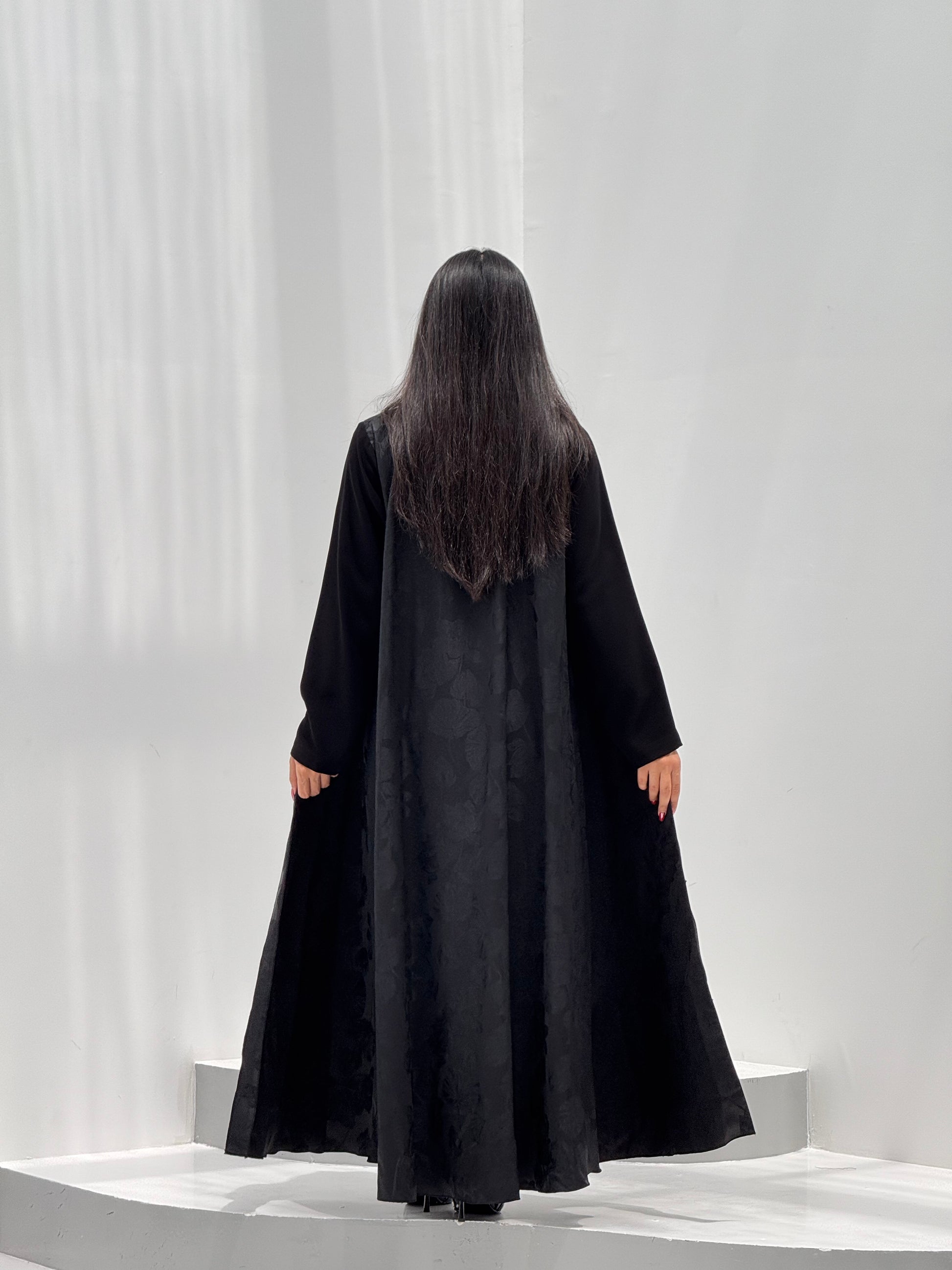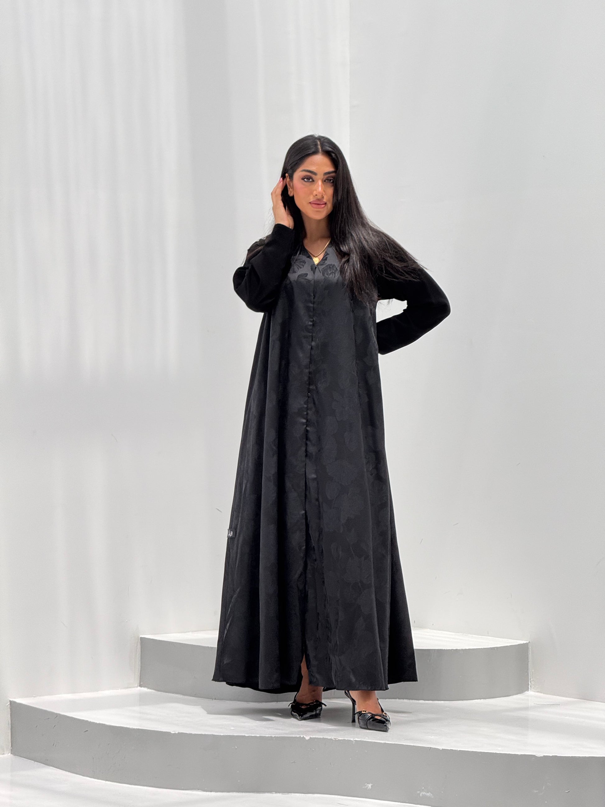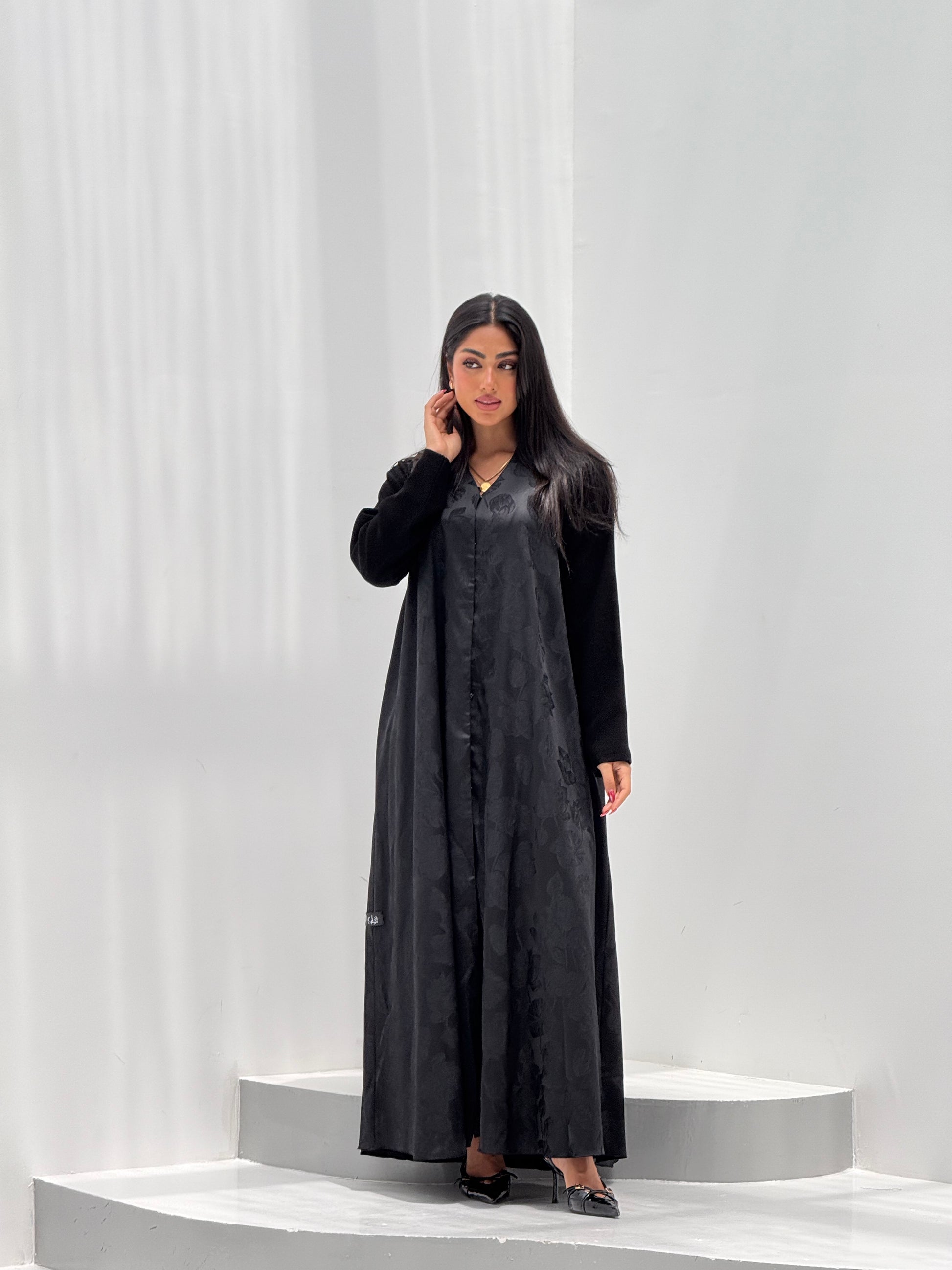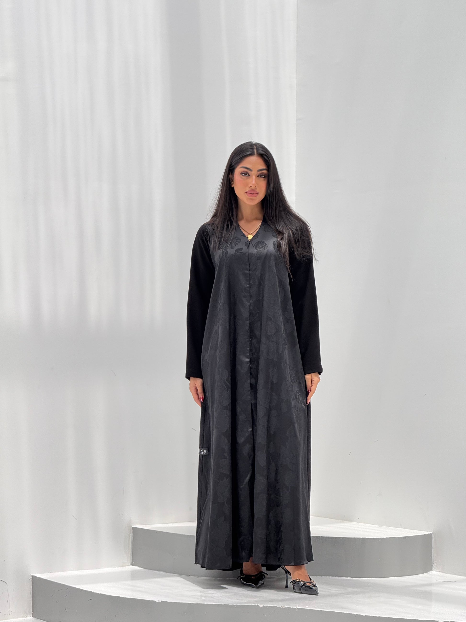 عبايه كلوش قطعة جاكارد فيها ورود مع اكمام كريب ساده