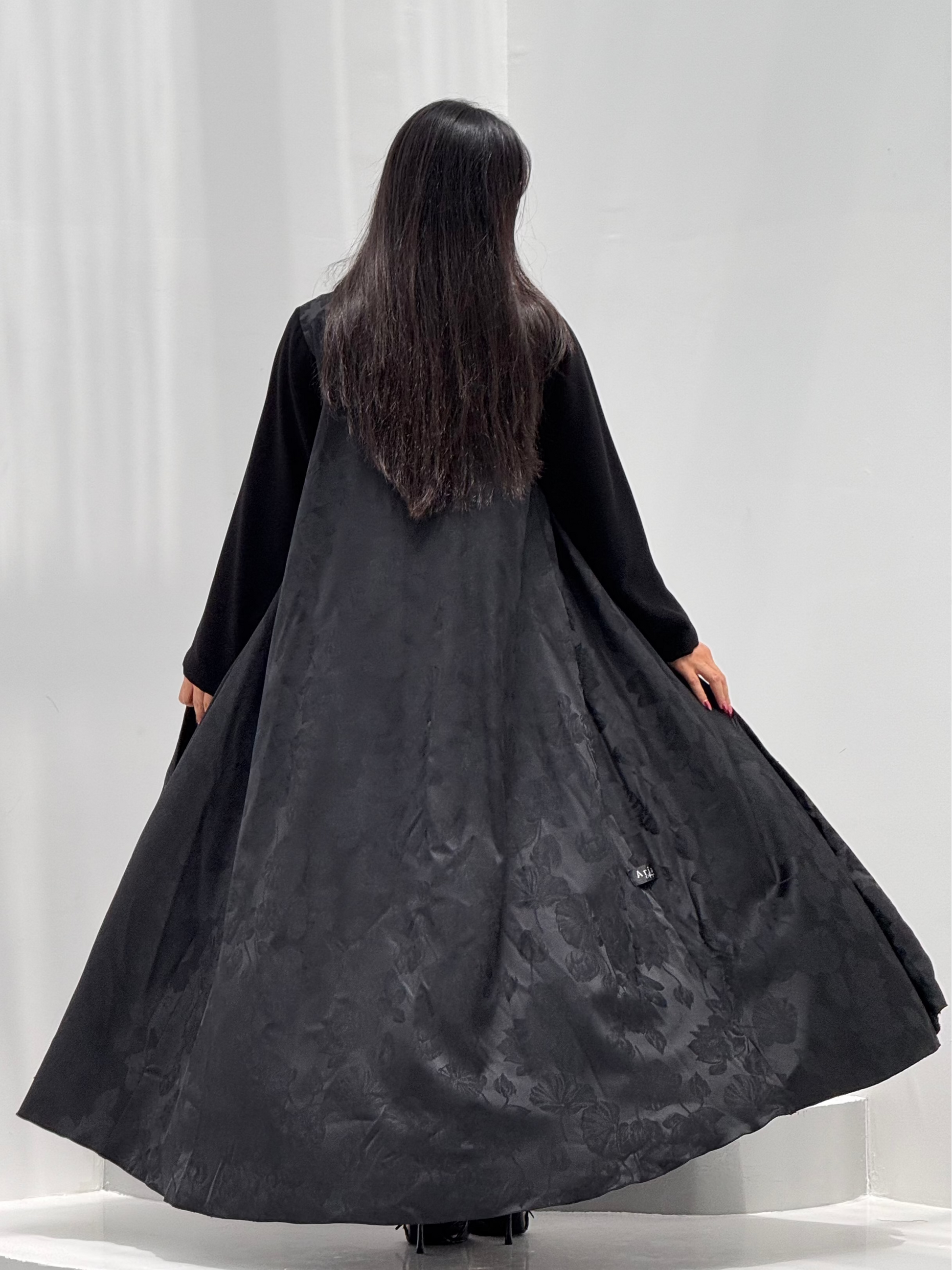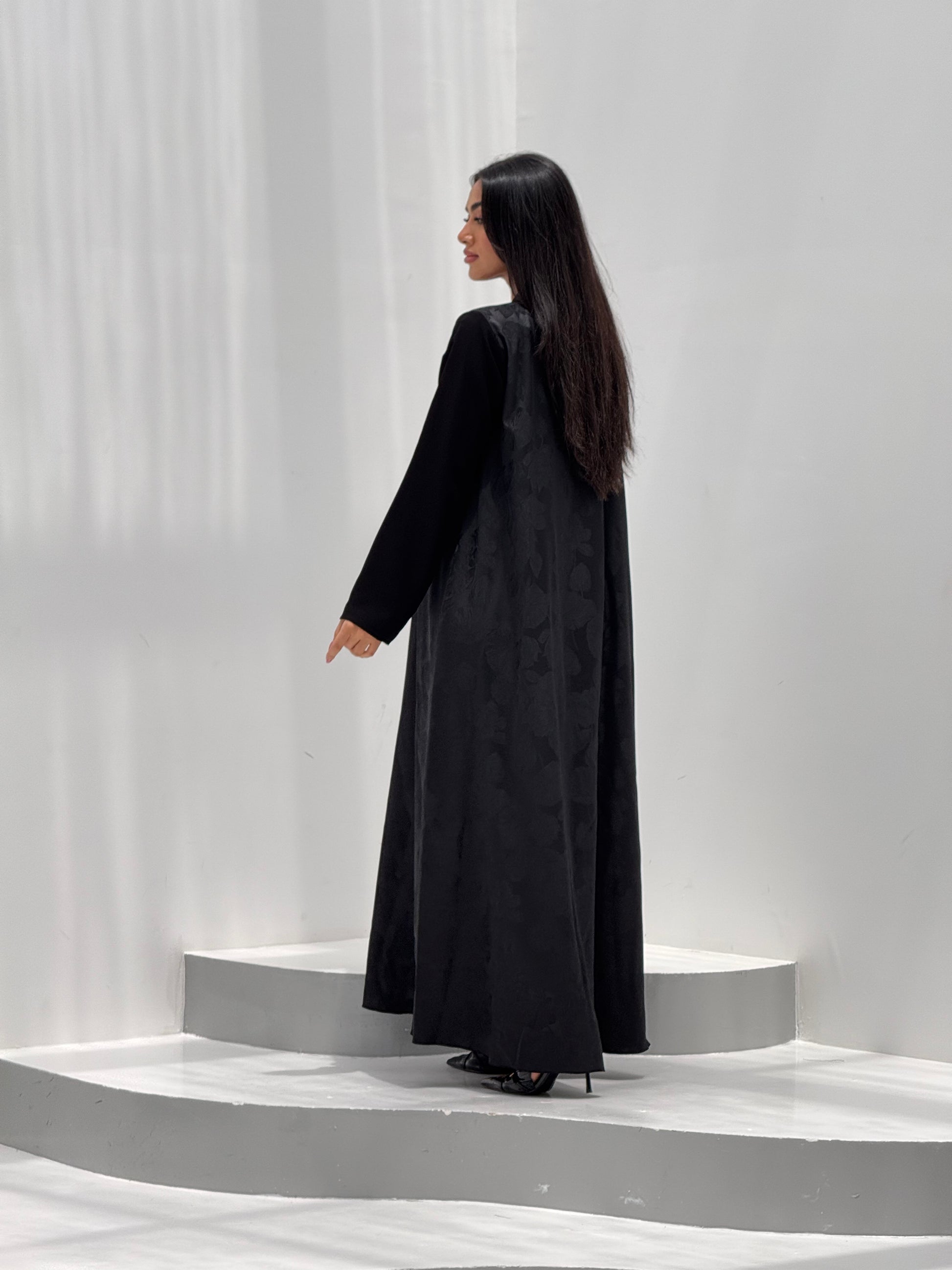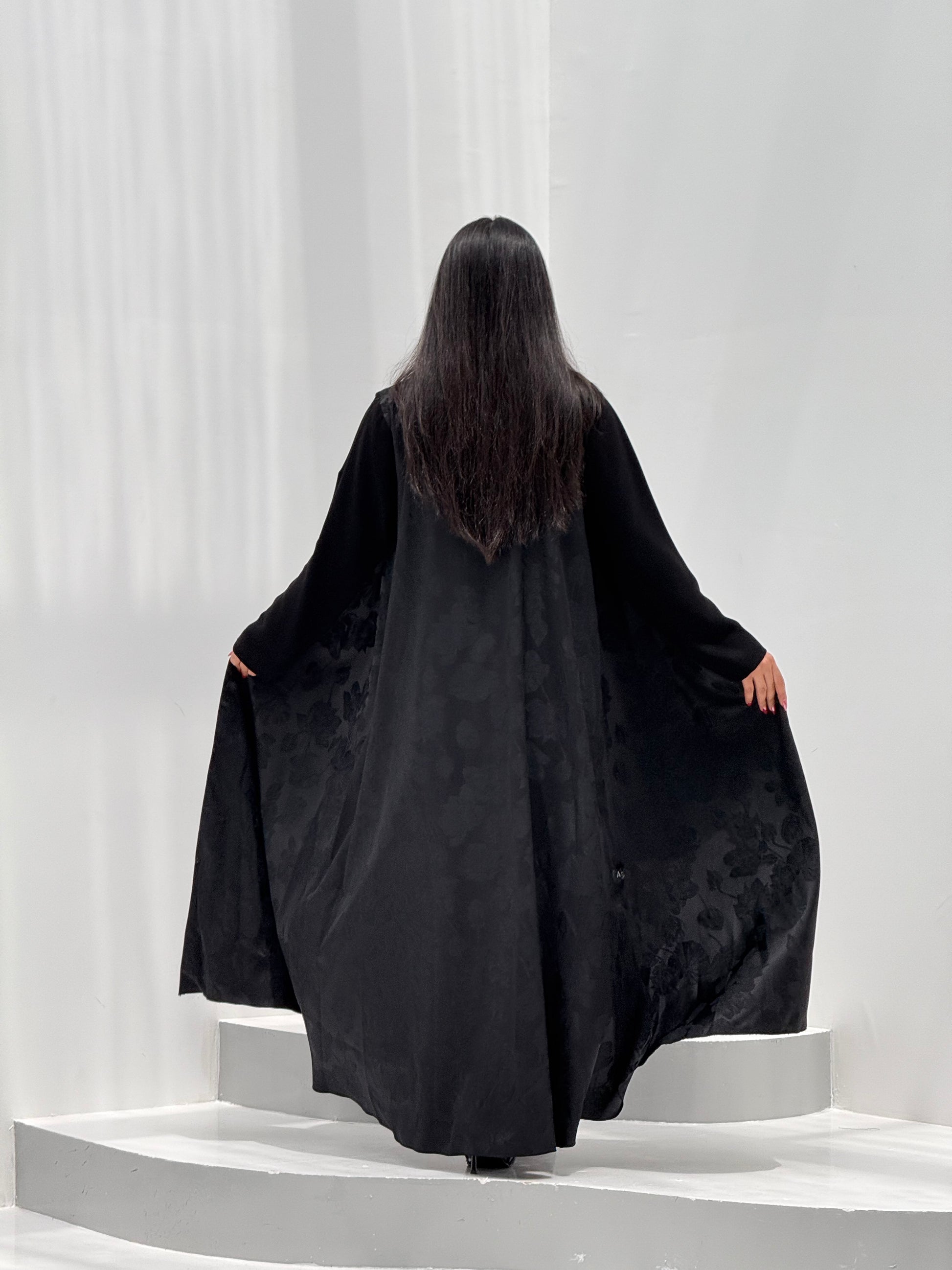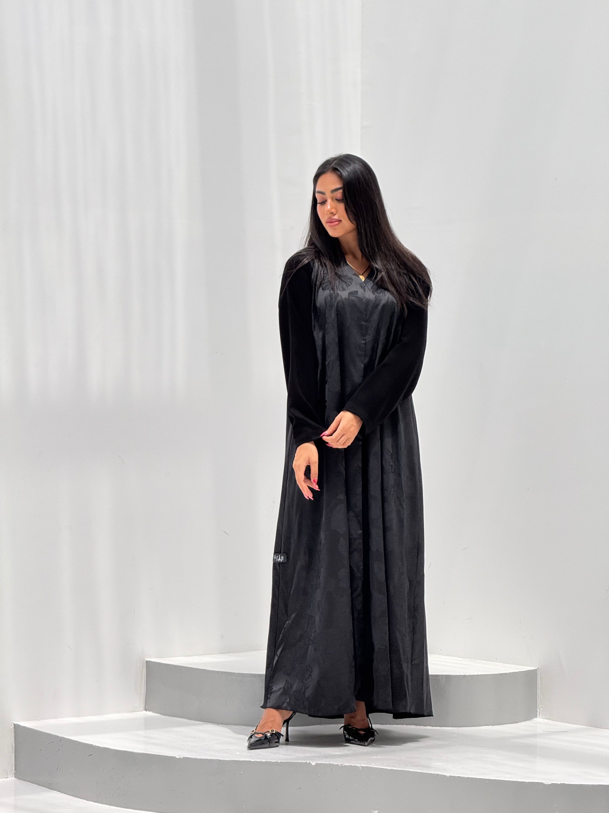 عبايه كلوش قطعة جاكارد فيها ورود مع اكمام كريب ساده